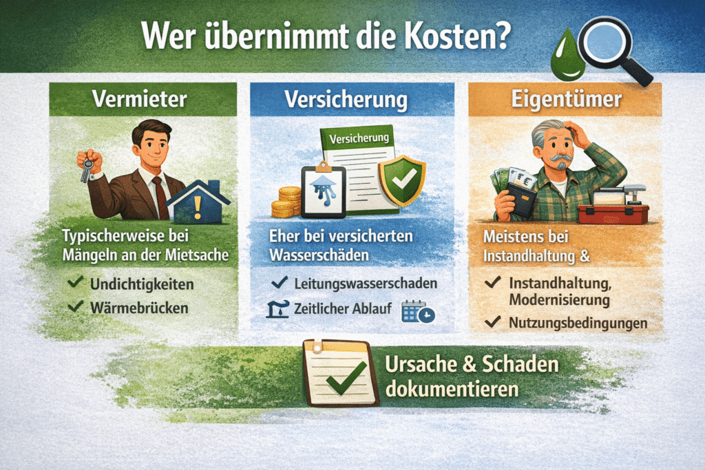 Die Kostenfrage ist technisch eng an die Ursache gebunden: Kondensat durch Nutzerverhalten wird anders bewertet als ein Leitungsleck oder ein baulicher Mangel. Deshalb dokumentieren wir den Befund so, dass Ursache und Schadensbild nachvollziehbar getrennt werden können.