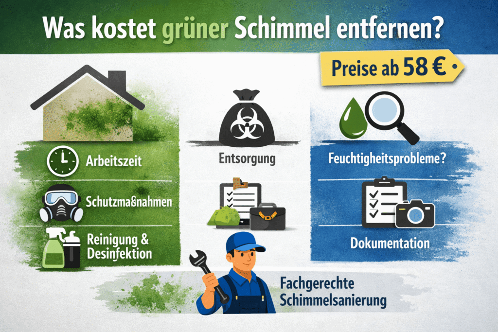 Beim Entfernen von grünem Schimmel entstehen in der Regel mehrere Kostenpunkte, die sich auch auf schimmelsanierung kosten pro qm beziehen können. Dazu zählen die Arbeitszeit für Abdeckung und Schutzmaßnahmen, Materialien für Reinigung und Desinfektion sowie die fachgerechte Entsorgung kontaminierter Tücher oder Tapetenreste.