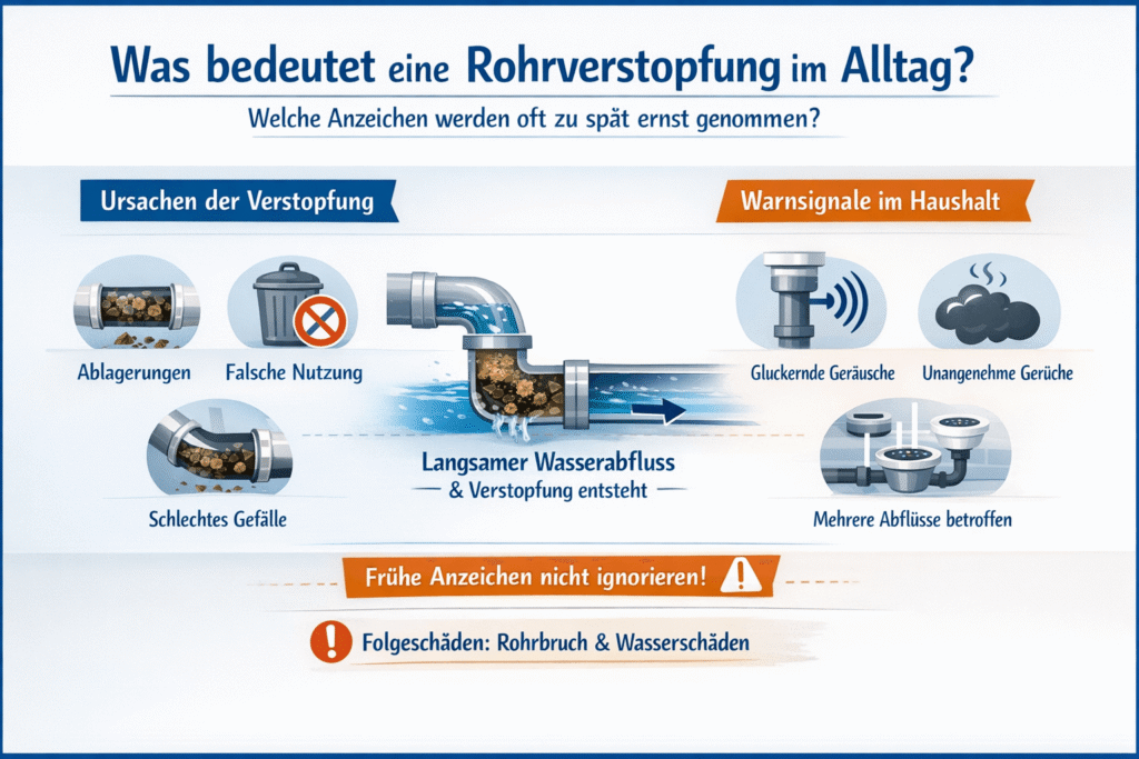 Im Gebäude entsteht eine Verstopfung selten „plötzlich“, sondern wächst aus Ablagerungen, falscher Nutzung und ungünstigen Rohrgefällen. Erst wenn Wasser langsamer abläuft, zeigt sich der Engpass an der Oberfläche. Häufig werden frühe Signale als harmlos abgetan, bis mehrere Entwässerungsstellen gleichzeitig betroffen sind.