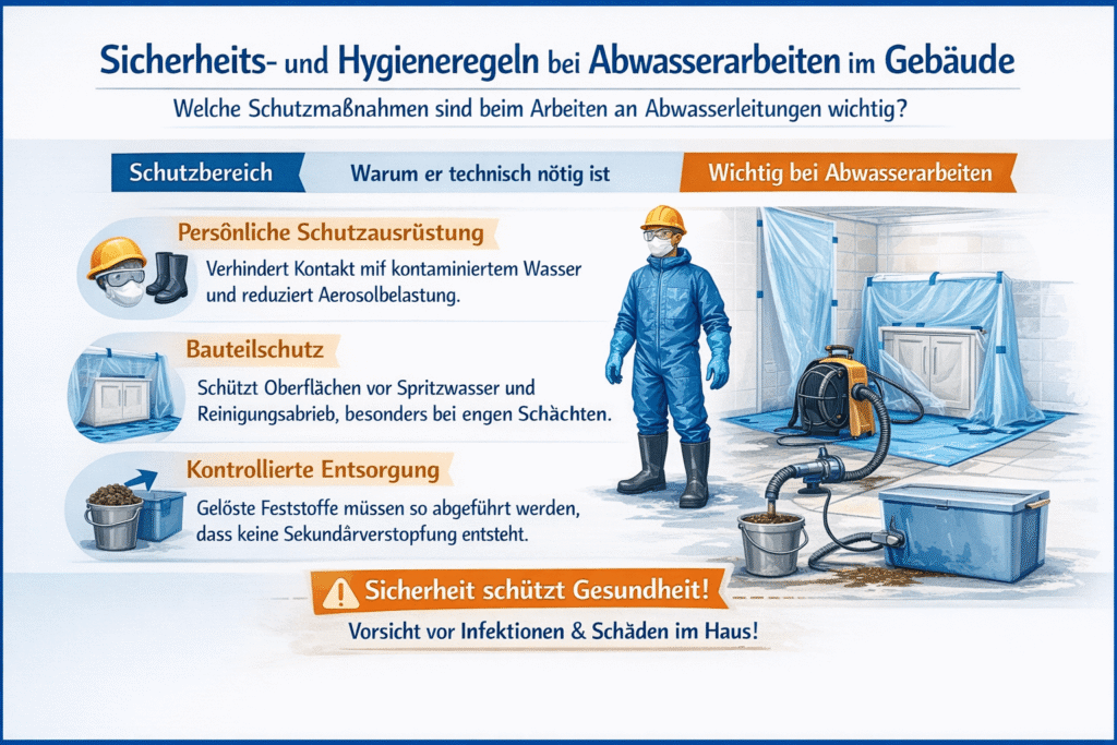 Abwasserarbeiten sind nicht nur „nass“, sondern hygienisch anspruchsvoll, weil Keime, Aerosole und kontaminierte Oberflächen entstehen können. Gleichzeitig werden bei Reinigungsarbeiten Kräfte in die Leitung eingeleitet, die bei falscher Absicherung zu Spritzern, Rückschlägen oder Schäden an Einbauten führen. Deshalb ist Schutz nicht Nebensache, sondern Teil der fachgerechten Ausführung.