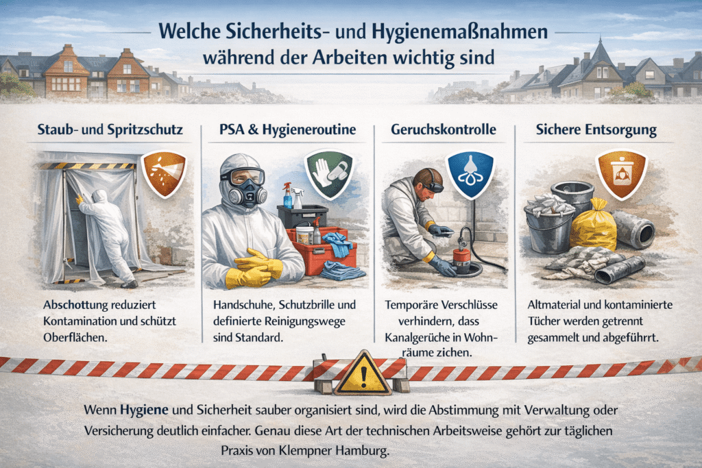 Bei Arbeiten an Abwasserleitungen geht es nicht nur um Sauberkeit, sondern um kontrollierte Exposition: Aerosole, Spritzwasser und kontaminierte Oberflächen müssen so gehandhabt werden, dass Bewohnerbereiche nicht belastet werden. Zusätzlich sind Stolperstellen, elektrische Risiken in feuchten Umgebungen und das sichere Handling von Werkzeugen in engen Schächten zu berücksichtigen.