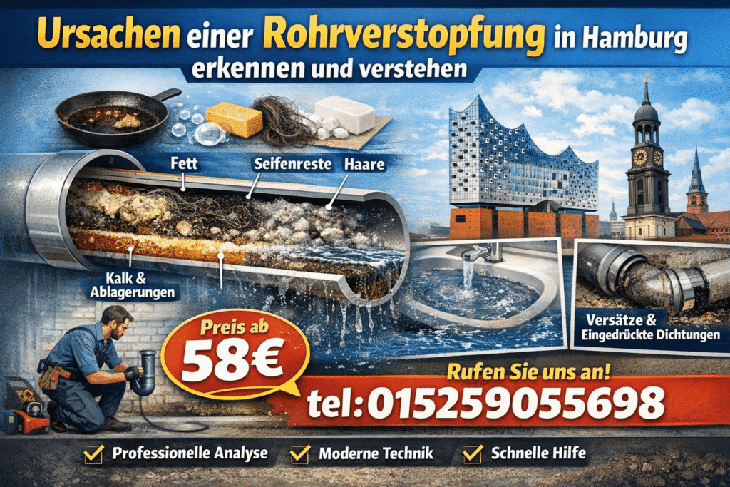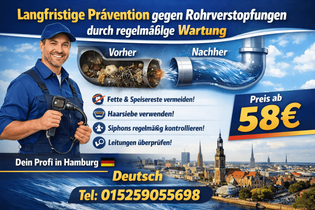 Für rohrverstopfung kosten hamburg gilt: Die Kosten beginnen in der Regel ab 58 €, abhängig vom Aufwand. Wir bewerten vor Ort Zugänglichkeit, Rohrmaterial und Ablagerungsart und dokumentieren den Eingriff, damit die Ursache nachvollziehbar behoben wird.