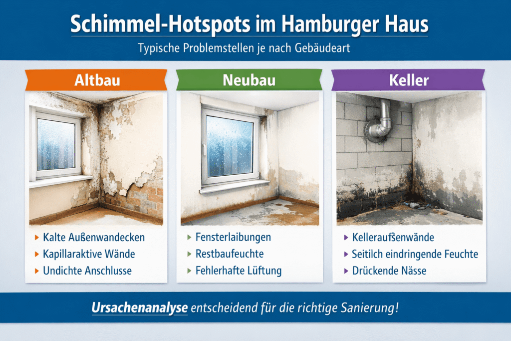In Hamburger Gebäuden zeigt sich Feuchte nicht überall gleich, weil Baualter, Dämmstandard und Nutzung das Temperatur- und Dampfdruckgefälle im Bauteil bestimmen. Typisch sind kalte Außenwandecken, Fensterlaibungen und Kelleraußenwände, wo Oberflächentemperaturen schneller unter den Taupunkt fallen.